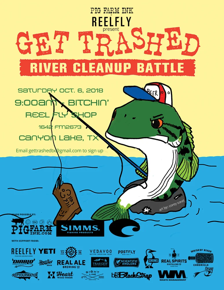 Pig Farm Ink, Costa, Simms, Reelfly, Real Ale Brewing Co, Yeti, Diablo Paddlesports, Howler Bros, and Real Spirits Distilling Co present Get Trashed, Reel Fly Shop, Austin, TX.